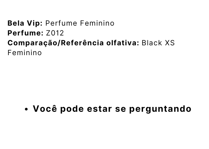 A fragrância do Bela Vip Z012 é muito similar ao Black XS Feminino, oferecendo a mesma elegância e frescor.